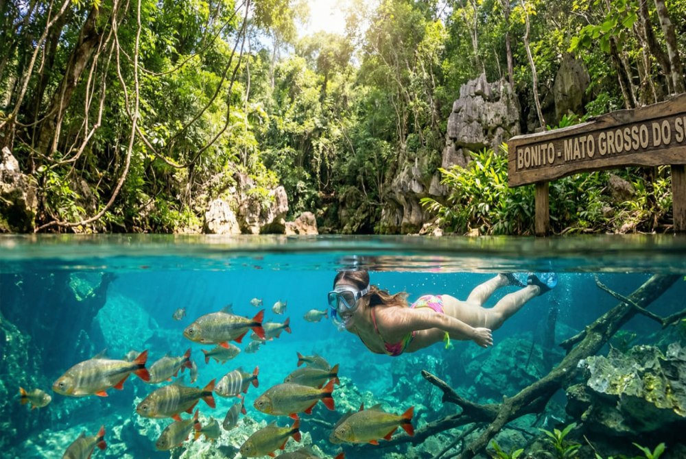A cidade de cerca de 22 mil habitantes recebeu mais de 293 mil turistas em 2025 e se consolidou como referência mundial em turismo sustentável, acumulando prêmios do Ministério do Turismo e chegando à final do Tourism for Tomorrow, premiação internacional do setor. Passeios sustentáveis em Bonito-MS, ideais para famílias, com balneários acessíveis e opções de aventura seguras. // Créditos: depositphotos.com / vbacarin